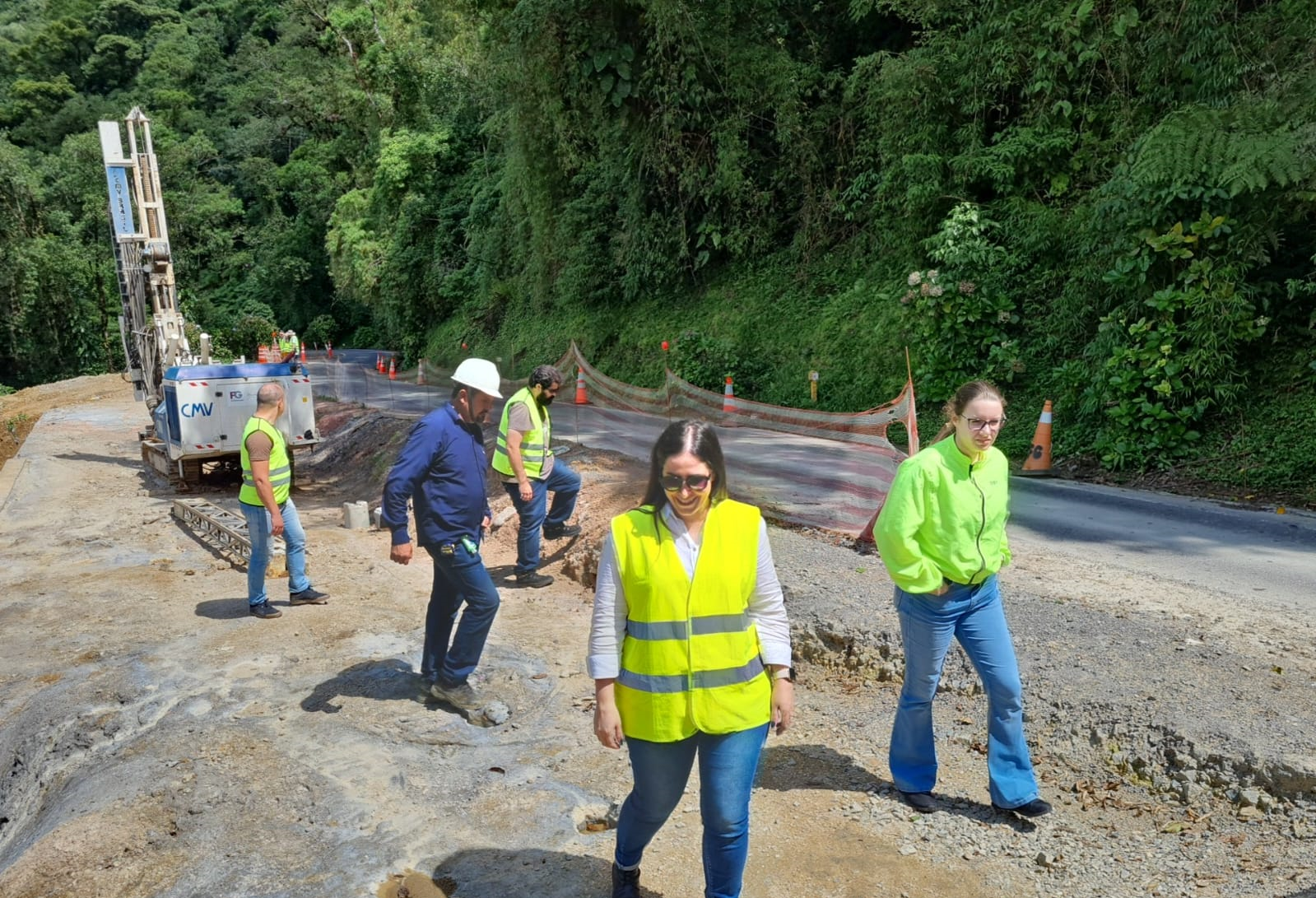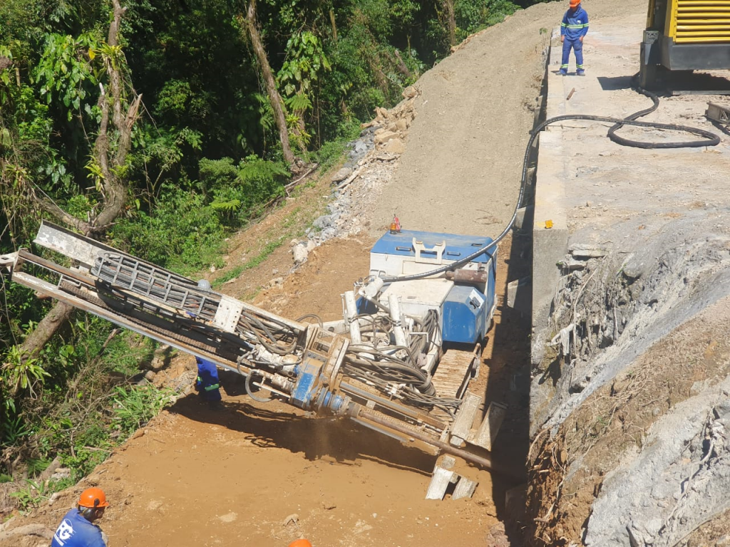 As equipes estão trabalhando em vários pontos da rodovia, incluindo a terraplenagem da encosta, corte de crista de talude, perfuração de rocha e reforço do muro de contenção.