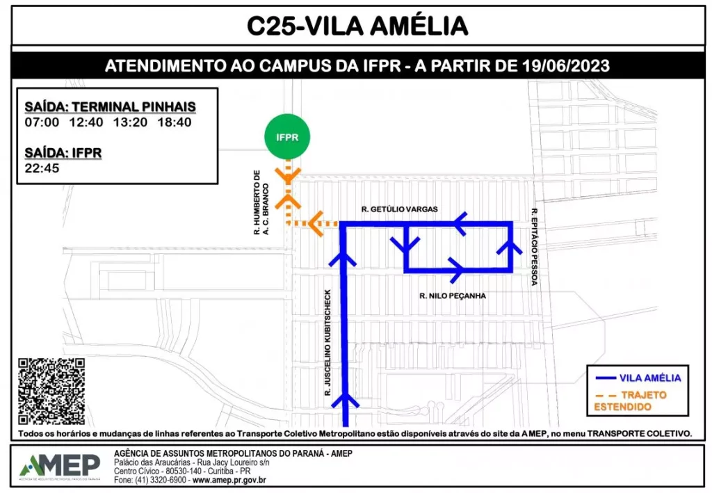 A Agência de Assuntos Metropolitanos do Paraná (AMEP) informou que a linha C25 Vila Amélia começou a operar uma extensão para atender o Instituto Federal do Paraná (IFPR), Campus Pinhais.