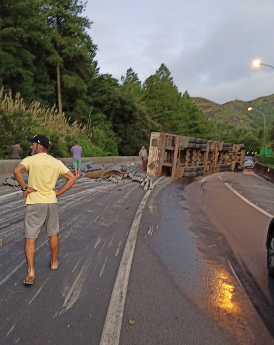Um tombamento de carreta foi registrado no km 32 da BR-116, na pista sentido São Paulo, em Campina Grande do Sul, no começo da noite deste domingo, 3 de abril de 2022.